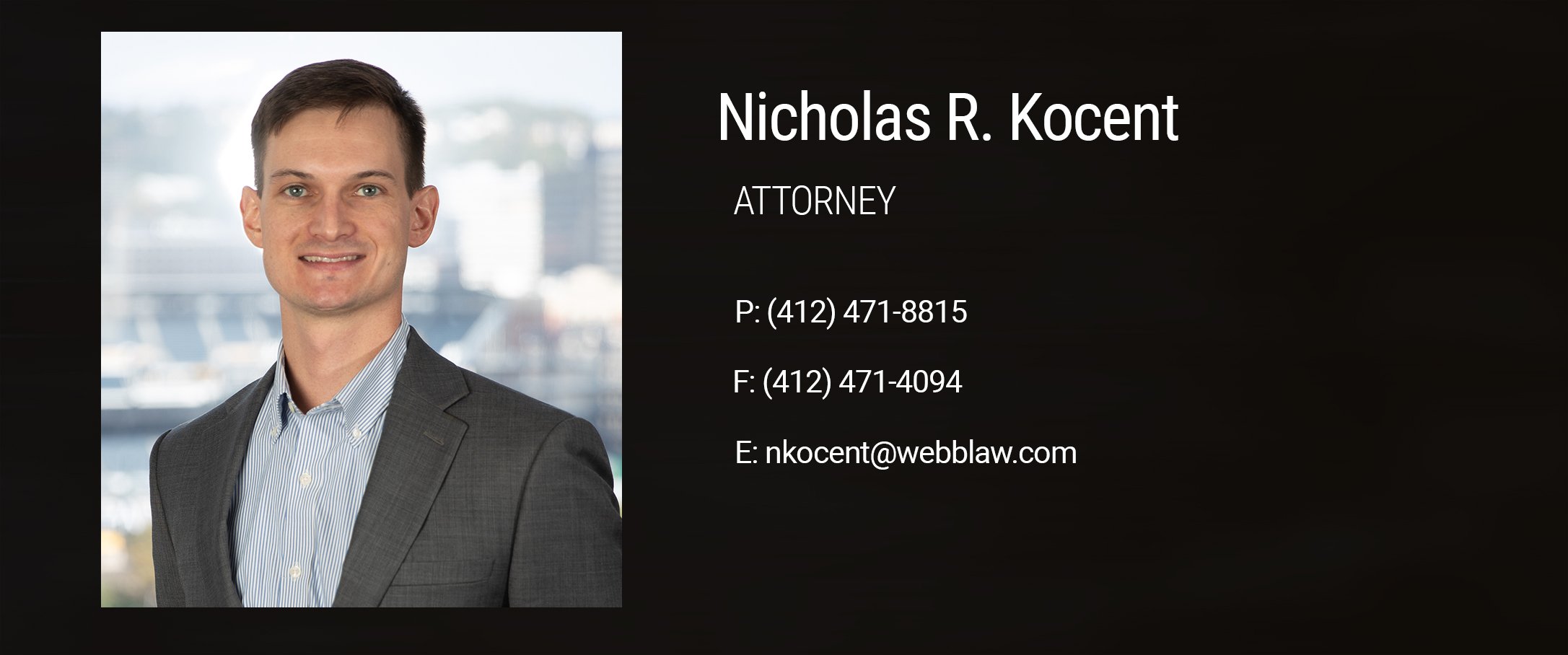 Nick is involved in several professional associations including the Pittsburgh Intellectual Property Law Association (PIPLA) and the Allegheny County Bar Association (ACBA) and spends his free time organizing The Webb Law Firm’s basketball team in the ACBA basketball league and serving as an assistant high school basketball coach.
